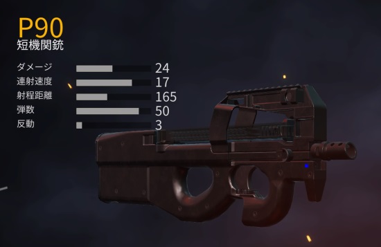 荒野行動のP90の表記されている性能は以下の通り。| ダメージ | 連射速度 | 射程距離 | 弾数 | 反動 |