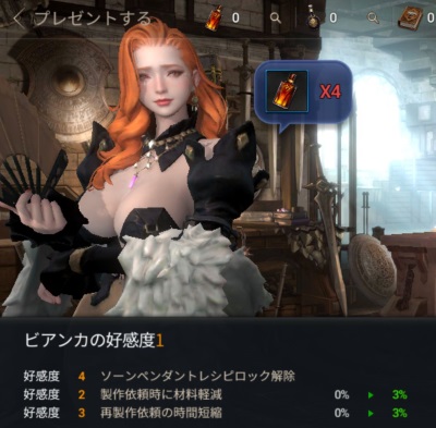 プレゼントを贈ることでビアンカの好感度が上がっていき、前述のレシピ解放や材料軽減、制作依頼の短縮といった恩恵を得られる。