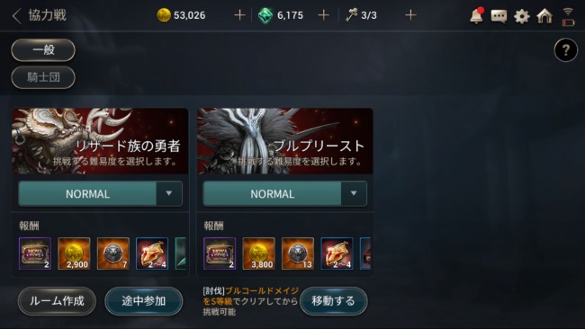 ②戦う魔物の難易度を選択して、「ルーム作成」または「途中参加」を選択する。