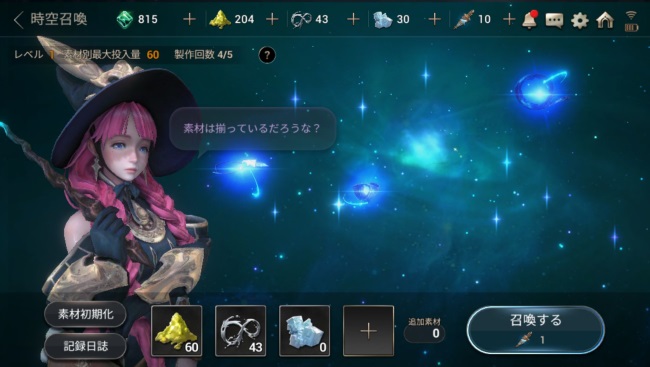 その後に画面左下の素材をタップすることで貯蔵庫に溜まった素材を回収できる。
