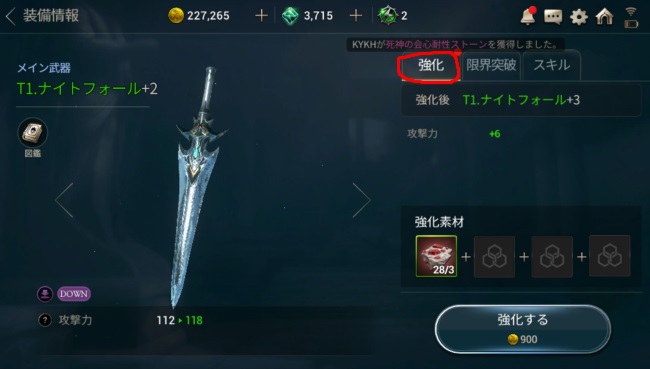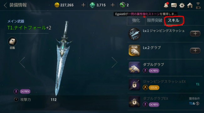 装備を「強化」することでスキルポイントを手に入れることができる。