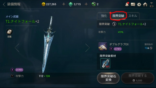 「限界突破」は限界突破タブで行うことができる。